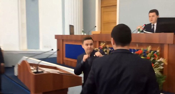 相關視頻顯示,當尤里走到演講臺后,就直接向鮑里斯揮起拳頭,而鮑里斯也不甘示弱,擺出一副拳擊者應戰的態勢迅速作出回擊,使得場面一度失控,直到隨后而至的安保人員上前勸架,才將扭打一團的兩人分開,這場鬧劇也才得以收場。