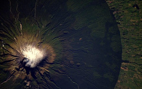 塔拉納基火山海拔約2500米,如龐然大物般屹立在新西蘭艾格蒙特國家公園。但在佩斯凱拍攝的照片中,它看起來像是一大片綠色森林中的一個小圓圈,遺世獨立,異常渺小。實際上,早在2013年,美國國家航空航天局的宇航員托馬斯·馬什本(Thomas Marshburn)就在網上分享過他在太空拍攝的塔拉納基山照片。不過,近日佩斯凱分享的照片才引發了眾人關注。