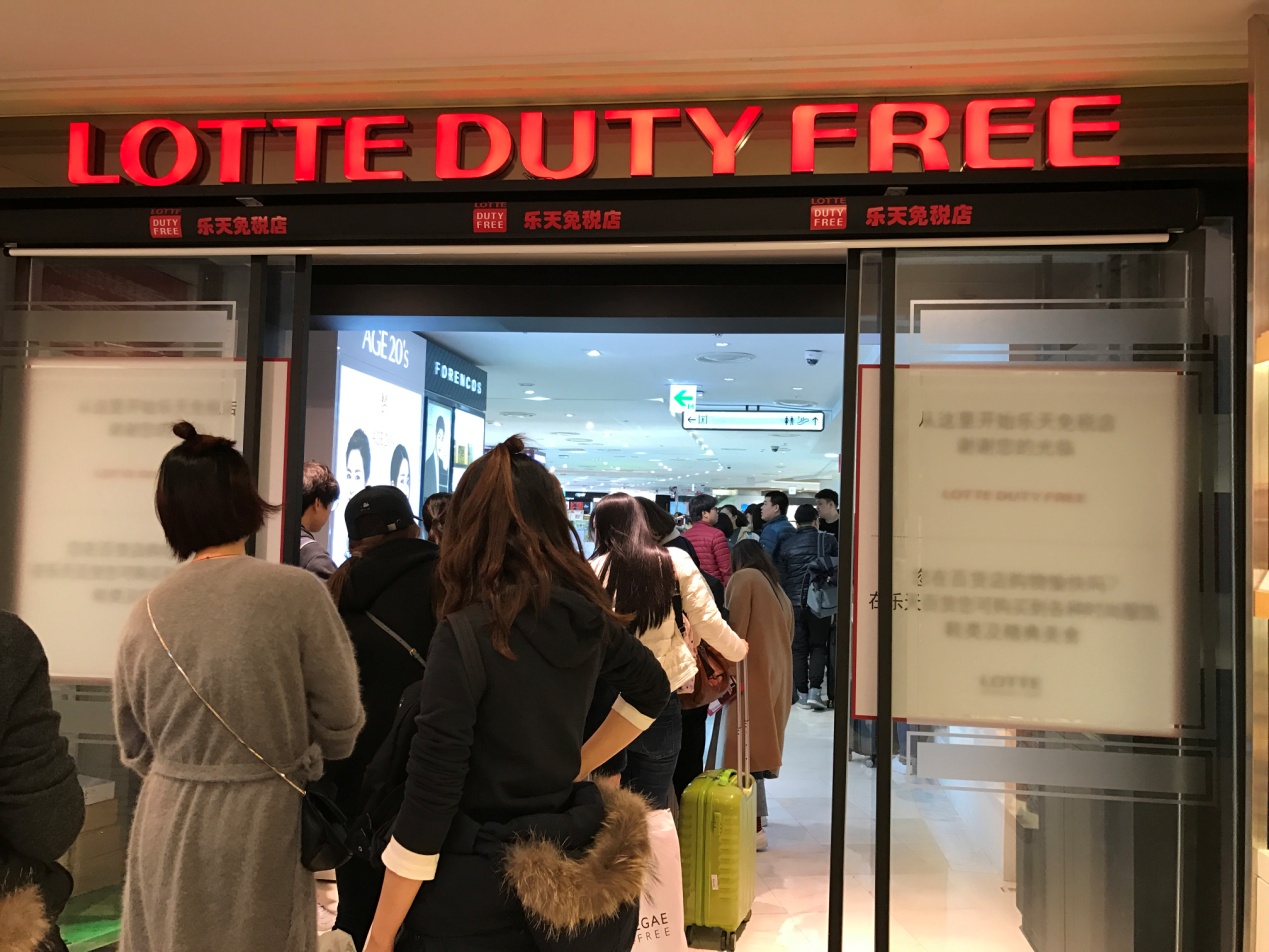 19日,首爾小公洞樂天免稅店里,中國游客排隊結(jié)賬!