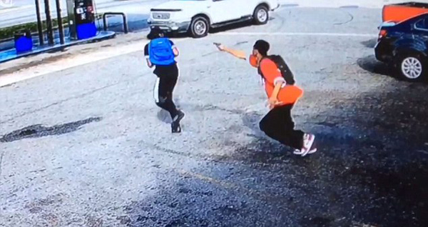 雜貨店門口的攝像顯示,托馬斯和馬諾發(fā)生了爭(zhēng)執(zhí),馬諾背著藍(lán)色的背包,一只手里還拿著一把槍。2個(gè)人爭(zhēng)執(zhí)了幾分鐘后,馬諾便把槍別在皮帶上,幾秒種后,穿著紅色T恤的托馬斯瞅準(zhǔn)時(shí)機(jī)迅速將槍拔了出來(lái),并朝著馬諾開(kāi)火。