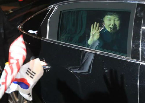 3月12日,樸槿惠乘車抵達(dá)位于韓國首爾三成洞的私邸并向支持者揮手。(新華社/法新社)