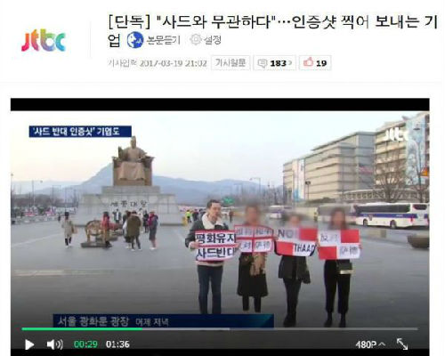 據(jù)韓國JTBC電視臺報道,一家韓國化妝品企業(yè)近日自覺選擇“站隊”,其員工在首爾市區(qū)公開舉行示威活動,他們舉著用中英韓文寫的“反對薩德”的標(biāo)語,以表明自己對于現(xiàn)政府部署“薩德”的反感。
