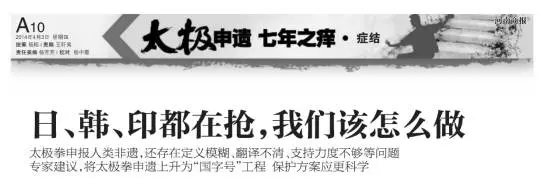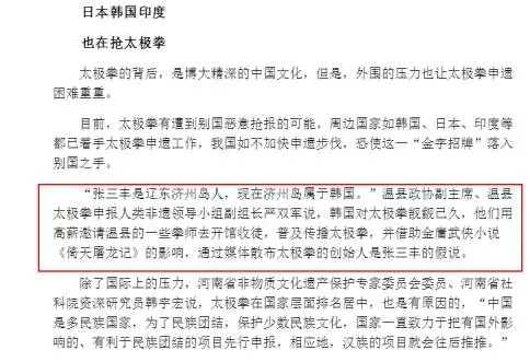 2014年4月初,中國某地方媒體刊發一系列關于太極拳申遺的報道。其中,某位太極拳申報人類非遺領導小組工作人員表示,張三豐是遼東濟州島人,現在濟州島屬于韓國。韓國對太極拳覬覦已久,借助金庸武俠小說《倚天屠龍記》的影響,通過媒體散布太極拳的創始人是張三豐的假說。