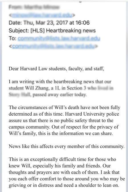 中國(guó)僑網(wǎng)3月25日電 據(jù)美國(guó)《僑報(bào)》報(bào)道,當(dāng)?shù)貢r(shí)間 3月23日,美國(guó)哈佛大學(xué)法學(xué)院向該學(xué)院群發(fā)了一封悼念信,信中緬懷了23日在宿舍內(nèi)去世的法學(xué)院中國(guó)留學(xué)生威爾 張(Will Zhang, 音譯),并表示他的逝世并不涉及公共安全問(wèn)題。