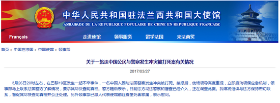中新網(wǎng)3月27日電 中國駐法國大使館27日在其官方網(wǎng)站通報《關(guān)于一旅法中國公民與警察發(fā)生沖突被打死案有關(guān)情況》,稱3月26日在巴黎19區(qū),一名中國人因與法國警察發(fā)生沖突被打死。中國駐法國大使館立即啟動領(lǐng)保應(yīng)急機(jī)制,聯(lián)系法國警方了解情況,要求其盡快查明真相。