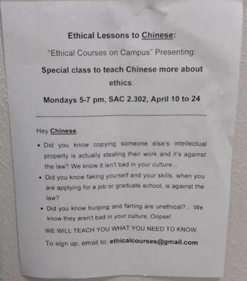 辱華布告的標(biāo)題為“給中國人上的道德課”,其中“中國人”一詞下面還加上了用于表示強(qiáng)調(diào)的下劃線。布告寫道:“中國人,你們知道復(fù)制別人的知識產(chǎn)權(quán)實(shí)際上是偷竊別人的成果并且是違法的嗎?我們知道在你們的文化這么做不是壞事……當(dāng)你們在找工作或申請研究生院的時候,你們知道在你們的信息和技能上作假是違法的嗎?” 此外,文中還指責(zé)中國人知不知道打嗝和放屁是“不道德的”,文中稱,“我們知道在你們的文化中這么做沒關(guān)系......哎喲!”