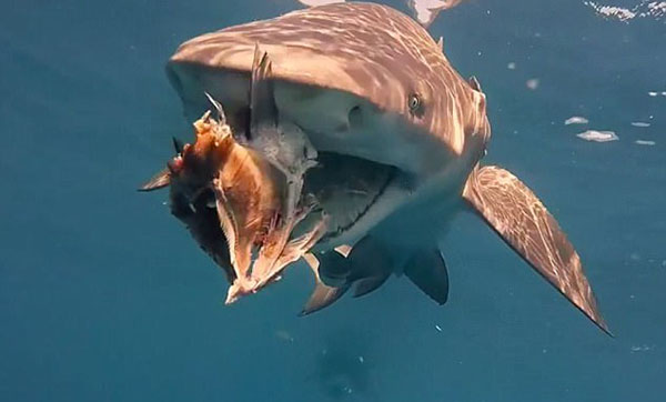 從拍攝到的視頻可以看見,博韋把食物投向一群檸檬鯊和絲鯊。鯊魚看見食物后朝他游來,幾乎與他擦肩而過,距離之近讓人不禁毛骨悚然。其中有一個鏡頭還近距離地拍到了絲鯊躍出水面接住食物的一幕。幸運的是,他并沒有受到任何傷害。在拍攝期間,作為一名自由潛水員,他沒有佩戴呼吸器。