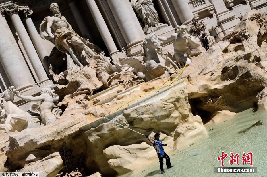 當?shù)貢r間2017年5月2日,意大利羅馬,一名工人在特萊維噴泉里收集硬幣。每年從噴泉里收集到的硬幣大約價值100萬歐元。