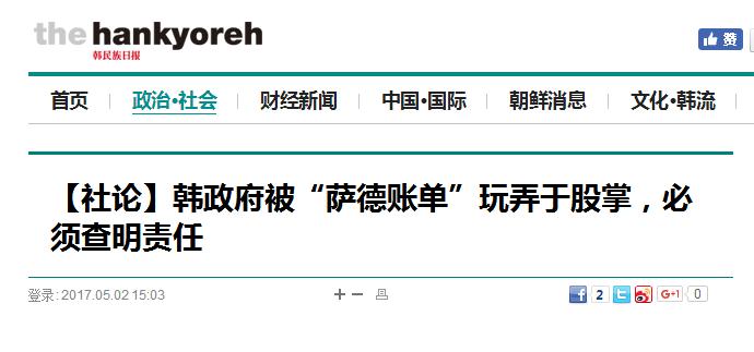【環球網綜合報道】日前,美韓圍繞著部署“薩德”的費用互相指責,令世界“大跌眼鏡”。對此,韓國《韓民族日報》5月2日發表題為“韓政府被‘薩德賬單’玩弄于股掌,必須查明責任”的社論稱,韓國在挨了美國背后一擊后,依然被美國牽著鼻子,未能作出妥善反應,只能苦苦掙扎...韓國政府竟然淪落到如此令人恥笑的地步,使人不禁感到憤慨。“既然事情已經發展至此,韓國就應該展開國政調查,查明薩德部署過程的詳細始末,切實追究責任”。
