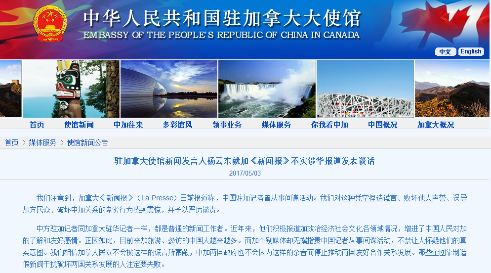 我們注意到,加拿大《新聞報》(La Presse)日前報道稱,中國駐加記者曾從事間諜活動。我們對這種憑空捏造謊言、敗壞他人聲譽、誤導加方民眾、破壞中加關系的卑劣行為感到震驚,并予以嚴厲譴責。