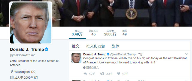 美國總統特朗普第一時間發推特表示祝賀。他在推文中說:“恭喜馬克龍在今日大勝成為下一任法國總統。我非常期待與他合作。”