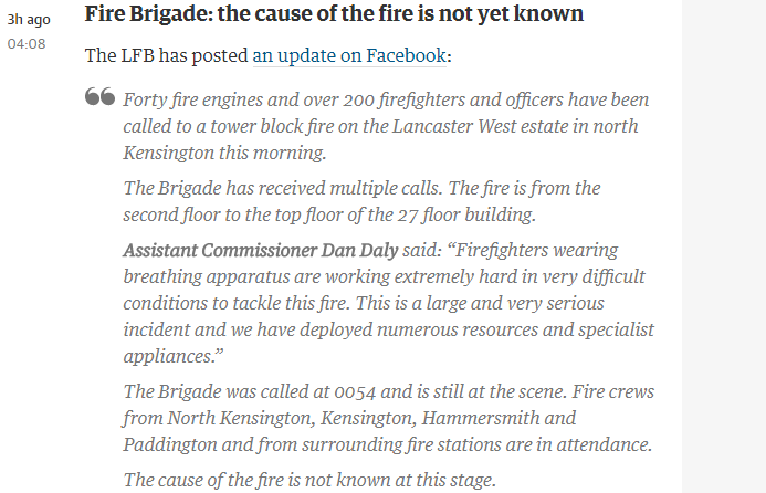 倫敦消防局2小時前在社交網站“推特”上發布的一張照片顯示,大樓的一面已經被火焰吞噬。而消防局更早發布的消息稱,起火原因還未查明。