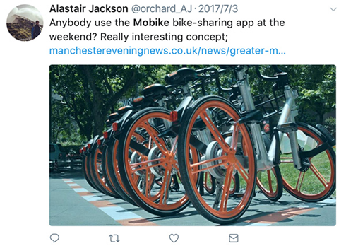 盡管六月的曼城陰沉又多雨,來自中國的共享單車還是受到了熱烈的歡迎。一覺醒來,發現滿大街都是嶄新閃亮顏值高的共享單車,曼城人興奮不已,立刻在推特上掀起一大波“炫車”浪潮。