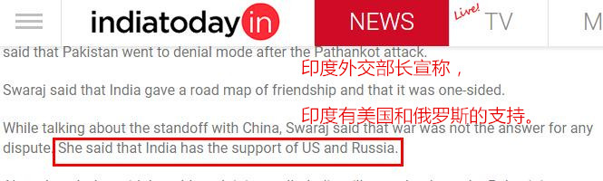 據《今日印度》網站8月3日晚間報道,印度外交部長蘇斯馬?斯瓦拉杰(Sushma Swaraj)在國會談及中印洞朗對峙問題時宣稱,印度為解決問題的路線圖是和平,并稱中國在印度的投資正在大規模增長,兩國正在持續談判。斯瓦拉杰還宣稱,戰爭不能解決爭端,印度還有美國和俄羅斯的“支持”。