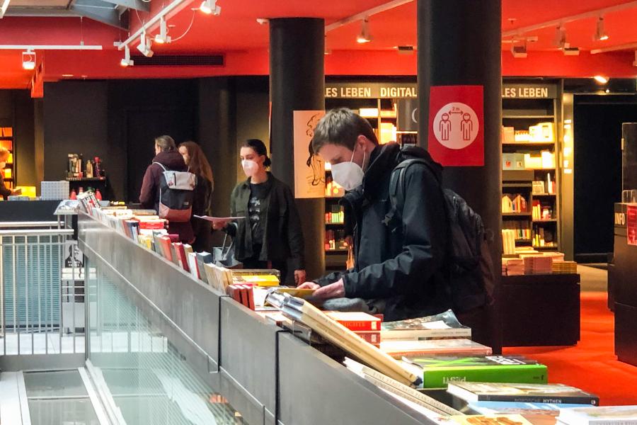 在柏林街頭常見的連鎖書店塔利亞,不少顧客戴著口罩挑選圖書。書店在入口處擺放了衛生安全須知,地面粘貼著保持間距的標識。有關疫情的科普和法律法規類書擺在門口最顯眼的貨架上。