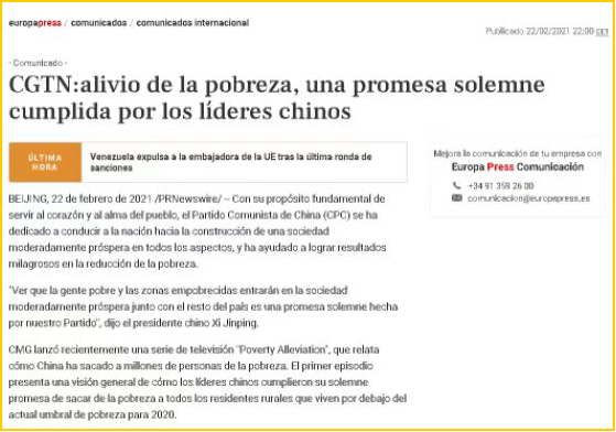 當(dāng)?shù)貢r(shí)間2月22日,西班牙歐洲通訊社和西班牙《機(jī)密報(bào)》分別轉(zhuǎn)發(fā)CGTN題為《脫貧攻堅(jiān)是中國(guó)領(lǐng)導(dǎo)人實(shí)現(xiàn)對(duì)人民的莊嚴(yán)承諾》的文章。文章指出:中國(guó)共產(chǎn)黨本著為人民服務(wù)的根本宗旨,在減少中國(guó)人口貧困方面取得了奇跡般的效果,實(shí)現(xiàn)了領(lǐng)導(dǎo)人對(duì)人民的承諾。