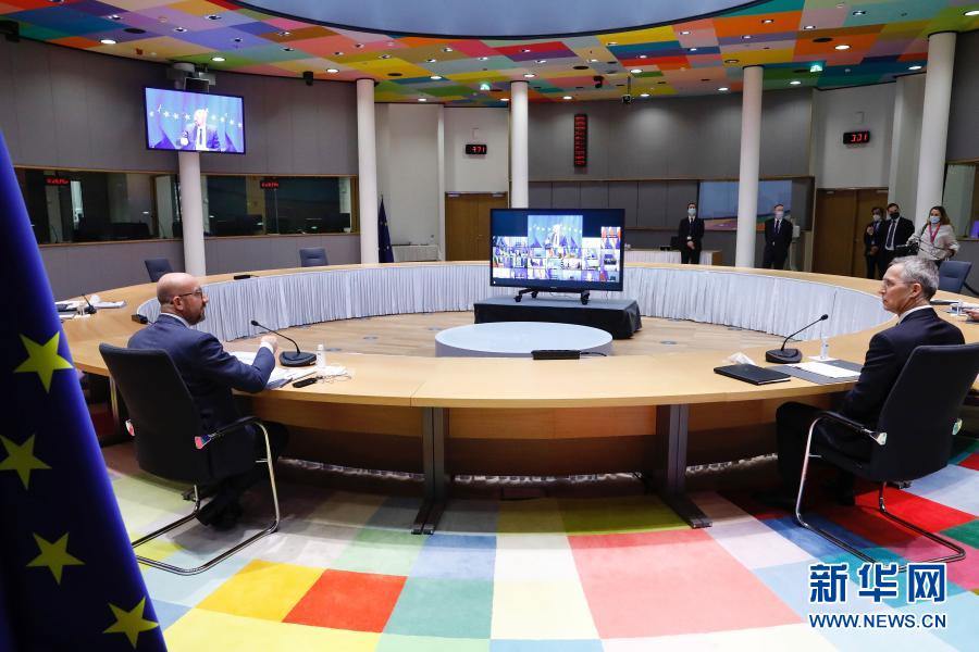 2月26日,歐洲理事會主席米歇爾(左)和北約秘書長斯托爾滕貝格在比利時布魯塞爾共同出席歐盟領導人視頻峰會第二日會議。