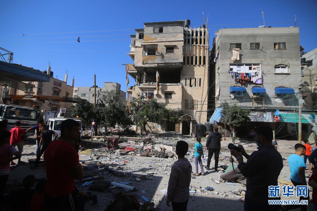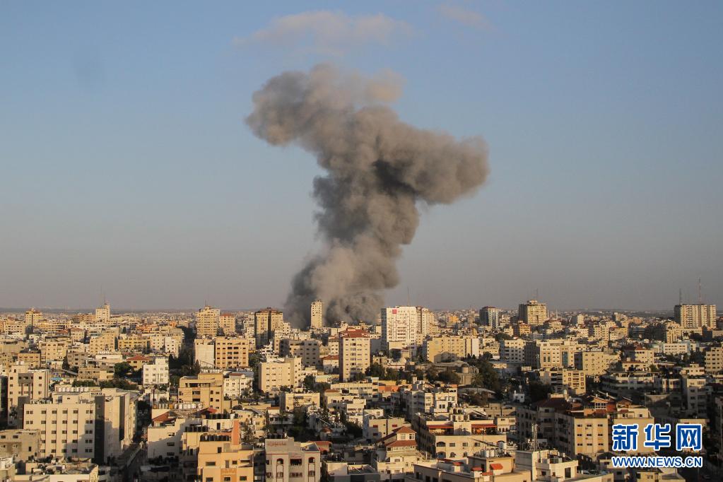 5月12日,加沙城一處建筑在以色列空襲中倒塌,現場升騰起濃煙。新華社發(里澤克·阿卜杜勒·賈瓦德攝)