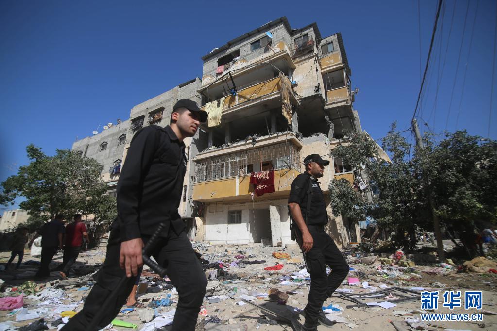 5月12日,巴勒斯坦警察在加沙地帶南部汗尤尼斯查看以色列空襲造成的破壞情況。新華社發(哈利德·奧馬爾攝)