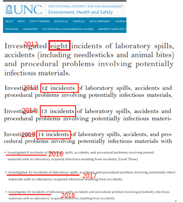 △根據北卡羅來納大學歷年年報提供的公開信息,巴里克的實驗室在2012年至2018年間發生的實驗室泄漏事故總數多達140起。