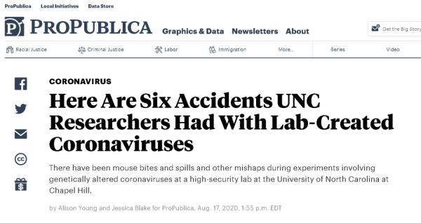 另據美國獨立調查媒體“專業公眾”網站去年8月報道,2015年1月1日至2020年6月1日,巴里克實驗室所在的北卡羅來納大學教堂山分校共向美國國家衛生研究院(NIH)報告了28起涉及轉基因生物的實驗室安全事故,其中6起涉及實驗室制造的多種冠狀病毒。