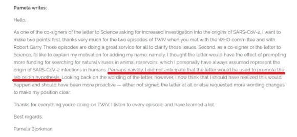 加州理工學院生物學教授帕梅拉·比約克曼就曾致信媒體澄清:自己參與在《科學》雜志上聯署所謂“公開信”的本意是希望幫助募集更多資金,用于在動物宿主中尋找病毒,病毒溯源問題被政治化讓她感到難過。