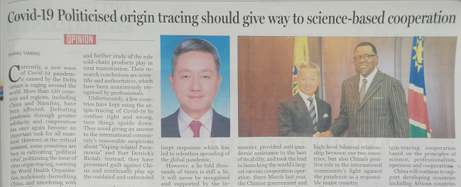 中國駐納米比亞大使在納主流媒體發文:病毒溯源不應被政治化、污名化、工具化