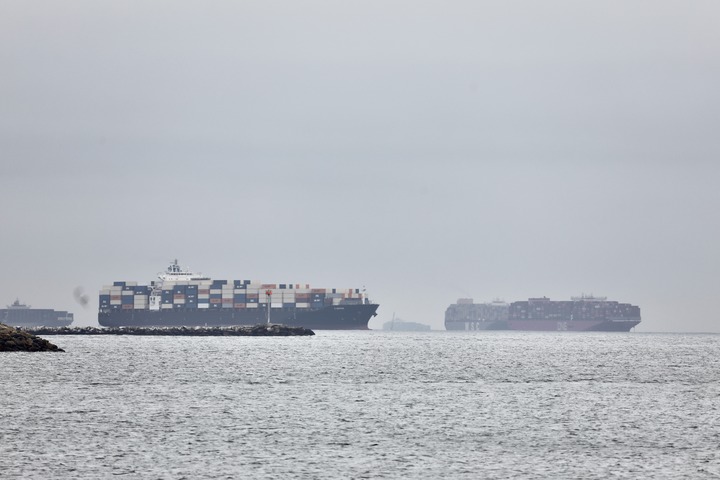 這是10月22日拍攝的在美國加利福尼亞州洛杉磯附近海域等待卸貨的集裝箱貨輪。新華社發