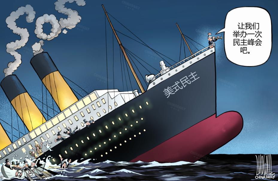 美式民主是泰坦尼克號(hào),明明要沉了,還要舉辦“民主峰會(huì)”。(漫畫(huà)作者:中國(guó)日?qǐng)?bào)美術(shù)部 羅杰)