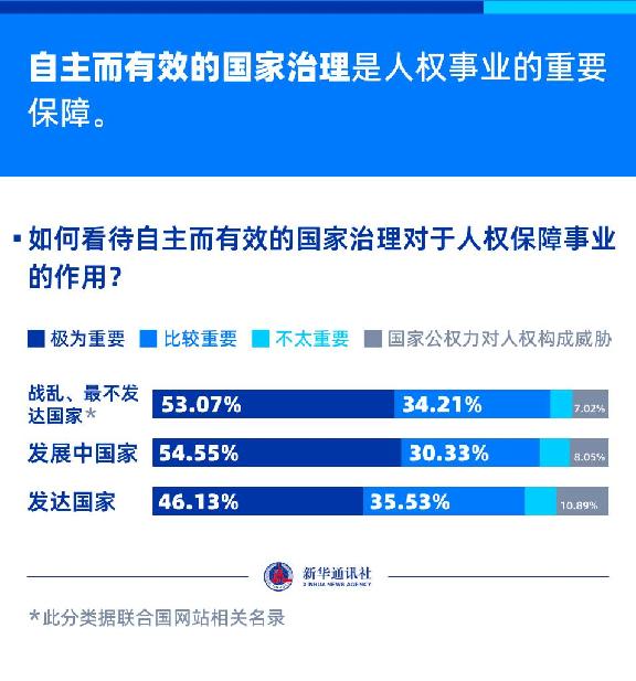 新華社這次問卷調查中,關于“自主而有效的國家治理對于人權保障的作用”,分別有超過52%和30%的受訪者選擇了“極為重要”或“非常重要”。