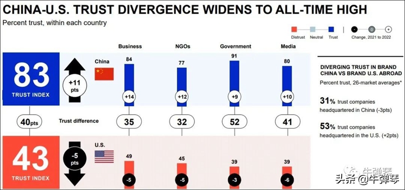 一個最大的發現,中國和美國對國家的信任度,分值之差達到了40百分點,是該報告創辦以來最高值。