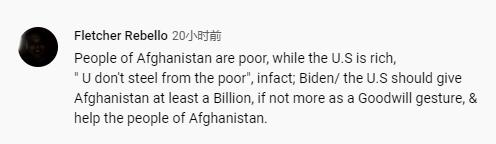網友Flecher Rebello稱,“阿富汗人民貧窮,而美國富有。你們不要偷窮人的了。實際上,拜登或者美國應該給阿富汗最少10億(美元),幫幫阿富汗人”。