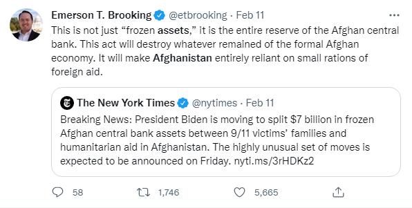網友Emerson T. Brooking指出,這不僅僅是“凍結資產”,它是阿富汗中央銀行的全部儲備。這一決定將使阿富汗完全依賴于少量的外國援助。