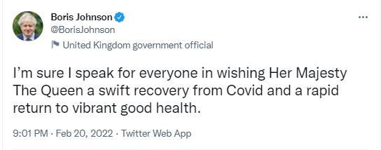 20日,英國女王新冠陽性,英國首相約翰遜在社交媒體發(fā)文祝愿她早日康復(fù)。圖片來源:英國首相社交媒體官方賬號截圖。