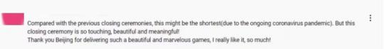 與此前的閉幕式相比,這可能是(時長)最短的(受新冠肺炎疫情影響)。但是這次閉幕式如此動人、美妙、充滿意義。感謝北京帶來了如此美妙非凡的體育盛會。我真的非常喜歡。