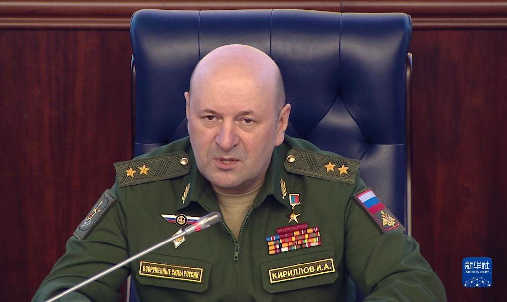 這張俄國防部提供的視頻截圖顯示,3月17日,俄軍輻射、化學和生物防護部隊司令基里洛夫在俄羅斯莫斯科出席吹風會。新華社/衛星社