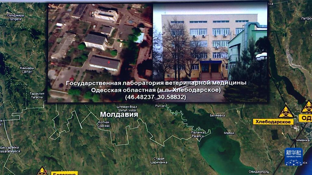 這張俄國防部3月17日提供的視頻截圖顯示的是,俄軍輻射、化學和生物防護部隊司令基里洛夫在俄羅斯莫斯科舉行的吹風會上展示的美在烏境內開展生物軍事項目的相關信息。新華社/衛星社