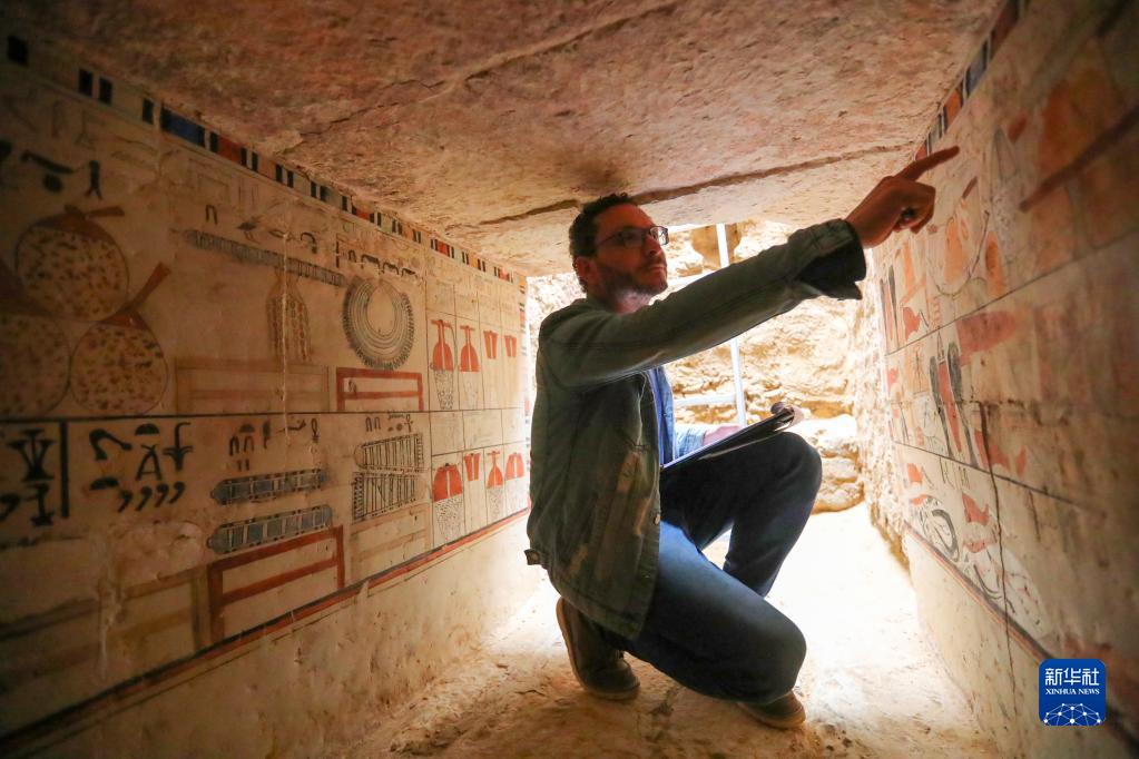 3月19日,在埃及首都開羅以南的塞加拉地區,考古工作者在一處古墓內介紹壁畫。