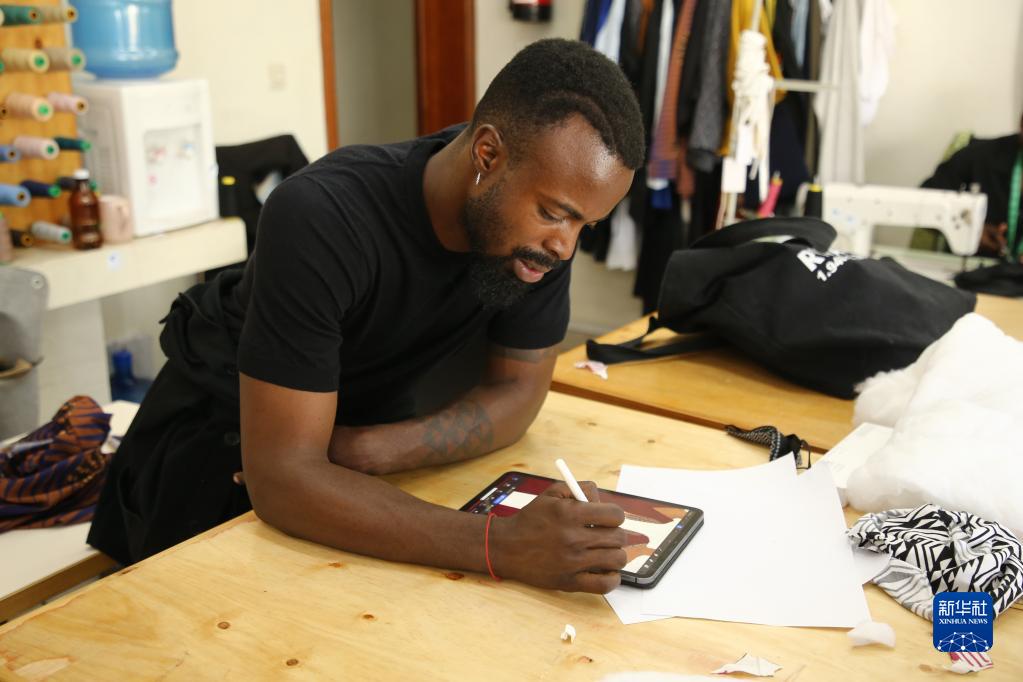 4月1日,在盧旺達(dá)首都基加利,Moshions品牌創(chuàng)始人摩西·圖拉希爾瓦在服裝品牌店的工作室內(nèi)繪制服裝草圖。新華社發(fā)(黃萬晴攝)