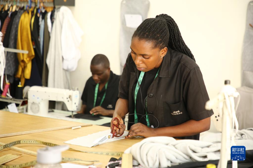 4月1日,在盧旺達(dá)首都基加利,工作人員在Moshions服裝品牌店的工作室內(nèi)制衣。新華社發(fā)(黃萬晴攝)