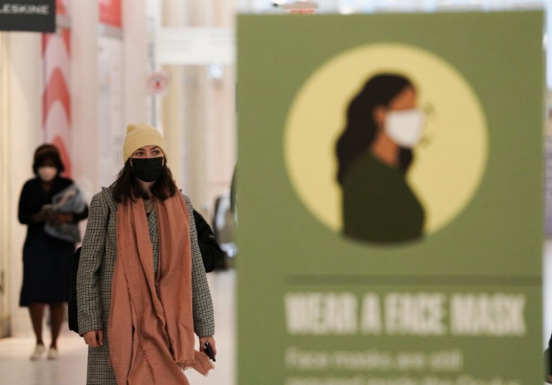 3月29日,人們從美國紐約世貿(mào)中心車站內(nèi)的防疫提示牌旁走過。新華社記者王迎攝