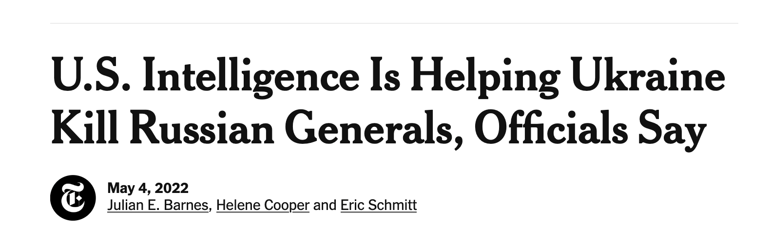 “有官員透露,美國情報正在幫助烏克蘭獵殺俄軍將領”。5月4日,《紐約時報》的這則報道,標題直截了當,內容吸引眼球。
