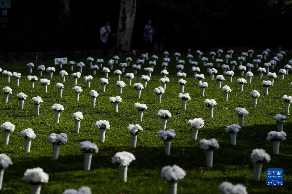 這是2021年10月8日在美國紐約炮臺公園內拍攝的為悼念槍支暴力遇難者擺放的白色瓶花。據主辦方介紹,這個由1050個白色瓶花組成的大型紀念裝置旨在悼念2020年在紐約州死于槍支暴力的1050名受害者,呼吁政府針對槍支暴力采取行動。新華社記者 王迎 攝
