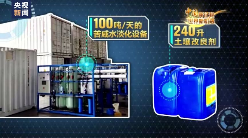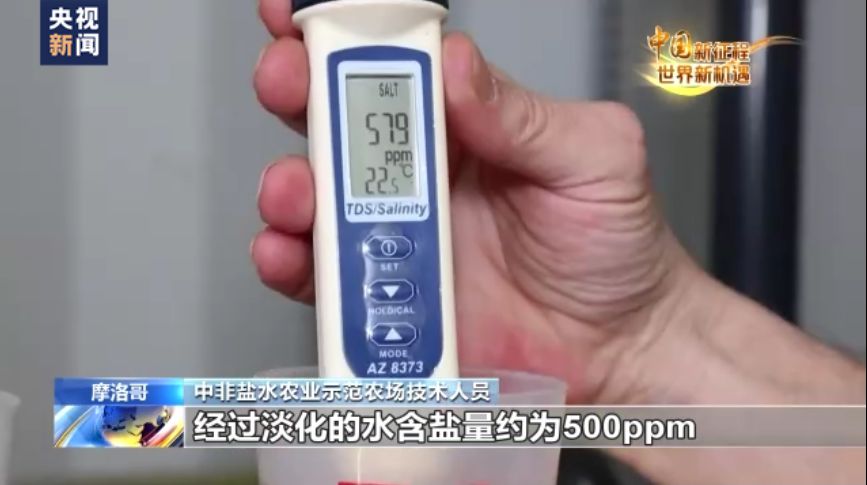 中非鹽水農(nóng)業(yè)示范農(nóng)場(chǎng)技術(shù)人員:經(jīng)過(guò)淡化的水含鹽量約為500ppm,而淡化之前,地下水的原本含鹽量可以看到是稍高于4000ppm。這真是太了不起了。