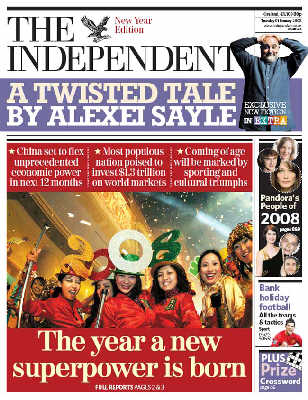 英國《獨立報》網站1月1日發表文章,題目是“2008:一個新的超級大國誕生之年”。文章說,世界上最新的超級大國來了。世界其他國家正對經濟增長放慢甚至衰退一籌莫展,北京卻是另一番景象。中國決心要使2008年成為確立其作為一個全球大國地位之年,在國際市場上一展其令人生畏的經濟實力,國內消費達到史無前例的高水平,并向世界展現一次光彩奪目的、花費高達200億英鎊的奧運會。