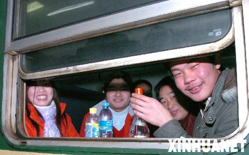1月31日,幾名乘客登上廣州火車東站開往洛陽的列車后露出笑容。 經(jīng)鐵路部門全力調(diào)度,目前京廣鐵路運輸秩序正逐步恢復(fù)。鐵道部支援廣鐵集團的第一批28列列車1月30日已全部上線運行。 新華社記者 壯錦攝