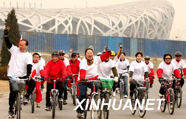 3月1日,自行車愛好者到達國家體育場“鳥巢”。當日,來自北京市各區縣的500多名自行車愛好者在北京市自行車運動協會的組織下,從先農壇體育場出發,參加“綠色騎行”活動。新華社發(李慧 攝)