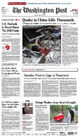 美國《華盛頓郵報》頭版:中國大地震死亡數千人