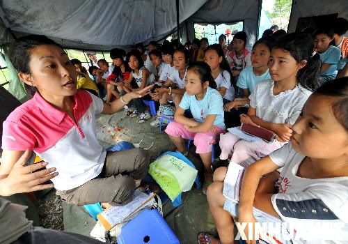 6月9日, 來自陜西安康水電廠的志愿者杜文娟(左一)在帳篷里為孩子們講述她來到四川地震災(zāi)區(qū)當(dāng)志愿者20多天的服務(wù)經(jīng)歷,鼓勵學(xué)生好好學(xué)習(xí),重建自己的美好家園。 當(dāng)日,志愿者教師在四川省江油市災(zāi)區(qū)的帳篷學(xué)校里和這里的近百名學(xué)生上完帳篷里的最后一課。 隨著四川地震災(zāi)區(qū)生產(chǎn)生活的逐步恢復(fù),失散的學(xué)生也陸續(xù)回到學(xué)校復(fù)課,災(zāi)區(qū)教學(xué)工作一天天走向正軌,一些帳篷臨時學(xué)校也由此結(jié)束其特殊使命。江油市帳篷臨時學(xué)校從5月19日開辦以來,前后共有60多個自愿者來到這里為孩子上課服務(wù),最多時這里的學(xué)生達(dá)400多名。 新華社記者 張國俊 攝