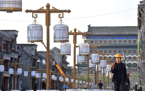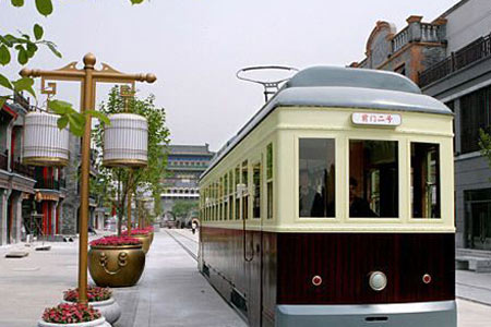 如果到游客們喜愛的琉璃廠古玩街參觀,也可能見到北京目前最神秘的建設工程:前門大街的復古改造。今后將在宏偉的前門城樓以南形成一條充滿中國特色的步行街。前門大街上還將開通有軌電車,首批車輛已經開始試運行。而大街兩側的傳統木質建筑則在為同樣具有傳統味的旅游項目做廣告。